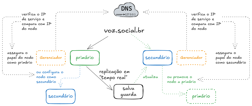 Quando o DNS do serviço for modificado para a estrutura secundária, o sistema gerenciador de alta disponibilidade providencia a promoção do nodo secundário à primário e obtém os dados mais recentes replicados na salva guarda intermediária.